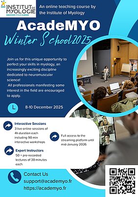 L’école d’hiver AcademyMYO de l’Institut de myologie (hôpital de la Pitié-Salpêtrière, Paris) se tiendra en ligne du 8 au 10 décembre 2025. Cet événement a pour objectif le perfectionnement des compétences en myologie.