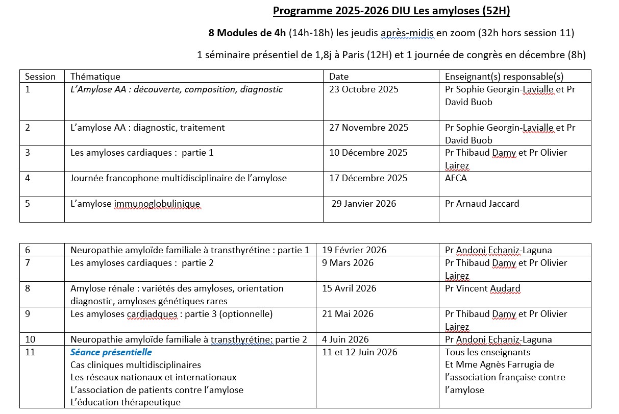 Ce DIU de Sorbonne université (Paris) et de l’université de Limoges, en collaboration avec l’Association française contre l’amylose, s’adresse en formation initiale aux internes de toutes spécialités, et en formation continue aux médecins de toutes spécialités, aux pharmaciens et aux professions paramédicales.